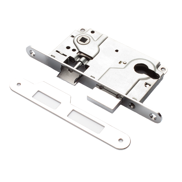 Замок врезной с корпусом, имеющим отверстия для ручки и цилиндра, межосевое расстояние 85 мм, бэксет 50 мм, планки - оцинкованная сталь.